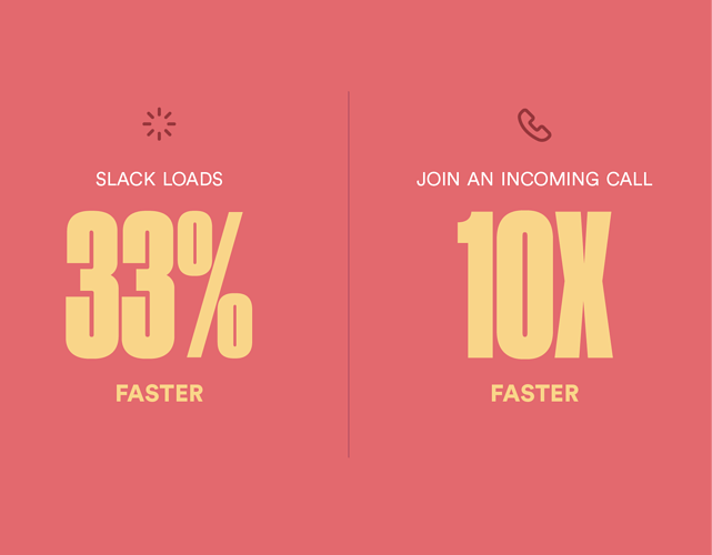 The Slack desktop app now launches 33% faster*, so you can jump straight into your work. Calls in Slack are also speedier, so you can join an incoming call with teammates up to 10X faster*. That could mean the difference between showing up to a meeting on time or not. These moments saved can quickly add up, giving you more time to focus on the tasks at hand.