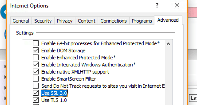 You’ll get the error again, go to internet options, advanced tab, scroll down and enable SSL 3.0
