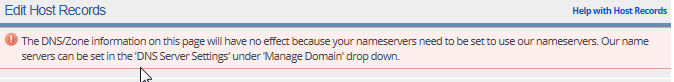 If you see a message in a red banner as shown below when going to the Host Records page, it means that your domain name is not using our default name servers. In this case, any changes you make to the host records on our control panel will have no effect on your domain name.