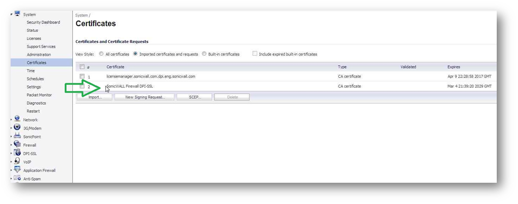 TIP: The certificate can be obtained by copy-pasting the following PEM encoded text into a text editor and saving it as SonicWallFirewallDPI-SSL.pem (with .pem extension).