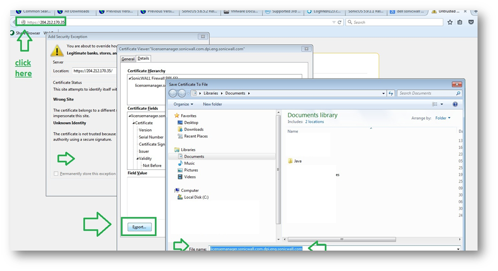 the certificate can be exported by accessing Https://204.212.170.35 from any Internet browser, here is an example on exporting the SonicWall Firewall DPI-SSL certificate using the latest FireFox browser.