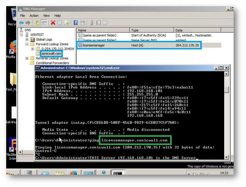 Screenshot below shows an example server 192.168.168.101 (DNS Server) which has an entry for licensemanager.sonicwall.com