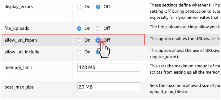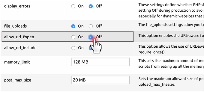Using the Hepsia Control Panel, you can disable URL-aware fopen wrappers with a click from the php.ini file area of the PHP configuration section: