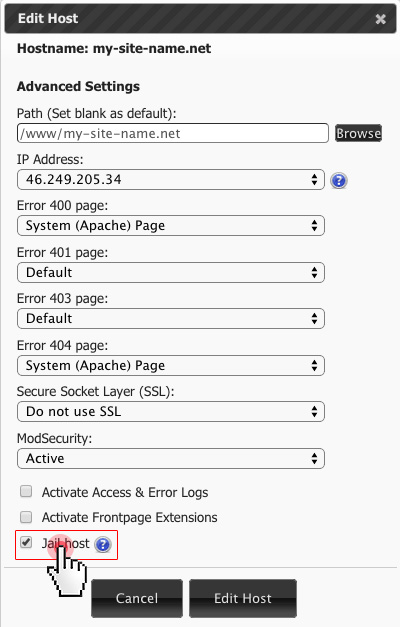 The ‘Jail Host’ option allows you to isolate a given host from the other domains within the www/ directory of a hosting account.