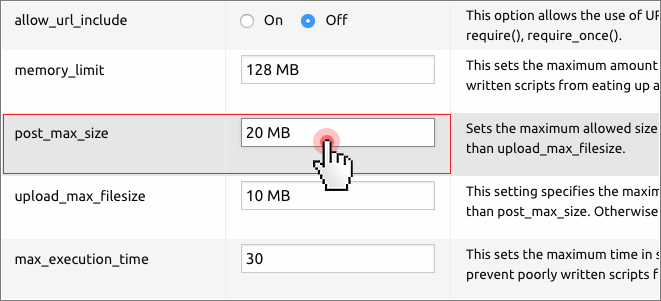 Provided your application has file upload capabilities, make sure that “ post_max_size ” has a set value at least as big as “ upload_max_filesize “: