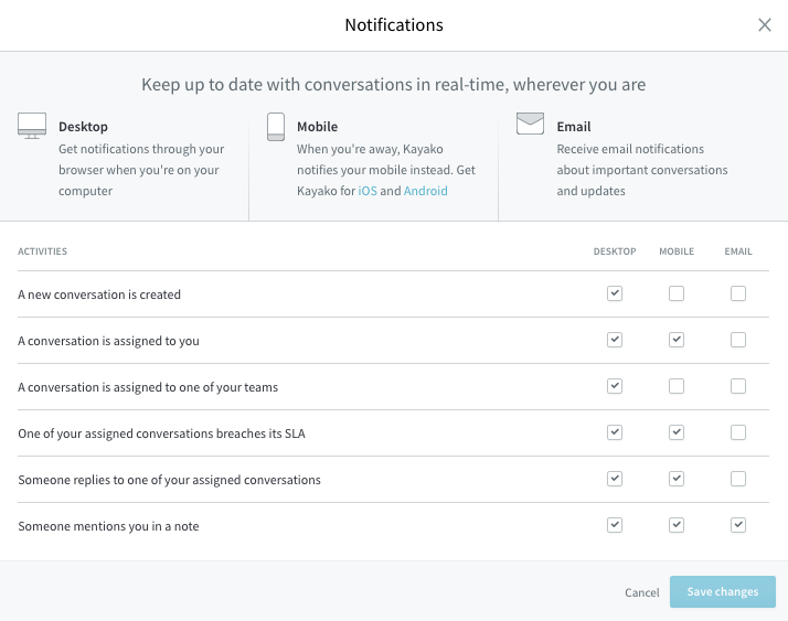 Here you can choose what kinds of updates you want to be notified about, and whether those notifications should come to your mobile, your browser, or your email. For mobile notifications, you’ll have to have one of the Kayako mobile apps installed on your device.
