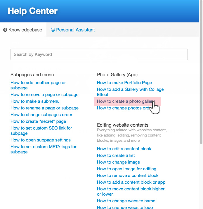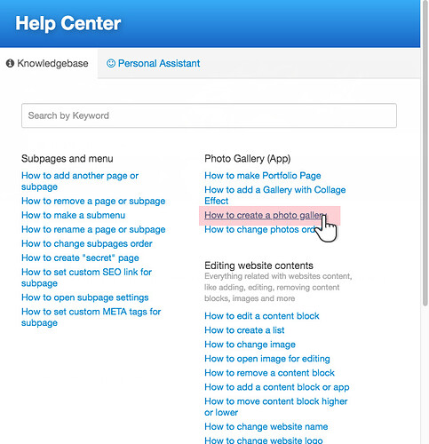 In the website menu, you can find a help section with a knowledge base and a personal assistant: