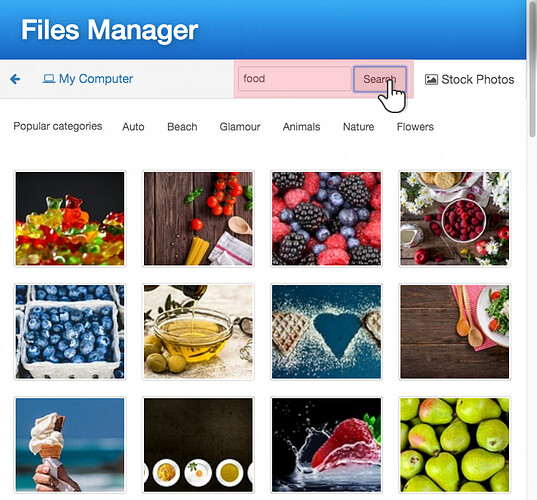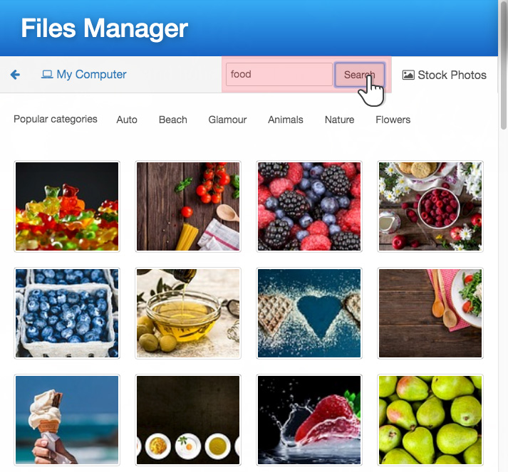 With the in-built File Manager you can easily upload your own files from your computer or access over 500 000 professional photos for free from one location: