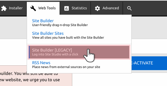 If you have already activated Site Studio in your account, you will be able to access it from the Site Builder (LEGACY) link under Web Tools.