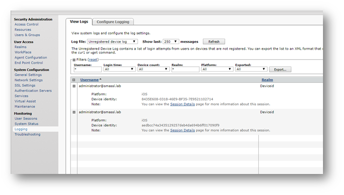 - With this change the new information would be logged under Management Console | Logging | View Logs | Unregistered Device logs. This section will display the new identifier:
