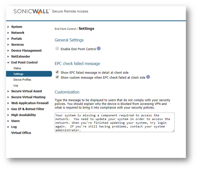 - An additional workaround is to disable EPC by navigating to End Point Control | Settings and un-checking Enable End Point Control :