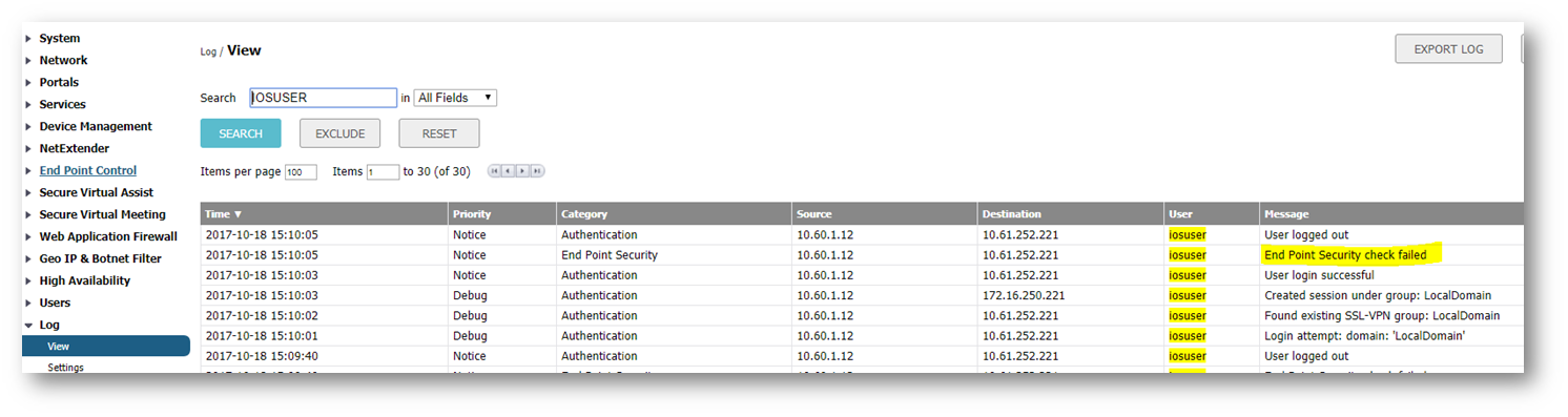 - When logged into the SMA 100 appliance administrators will see EPC failures in the log: