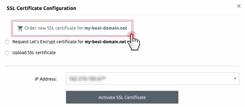 - A domain without an SSL – a special ‘add SSL certificate’ link will let the user order a regular SSL, request a ‘‘Let’s encrypt’ certificate or upload an SSL, which has been obtained from somewhere else.