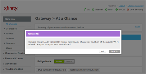 - A message appears stating “WARNING: Enabling Bridge Mode will disable Router functionality of Gateway and turn off the private Wi-Fi network. Are you sure you want to continue?” Click OK to confirm.