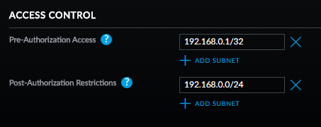 - As explained in step 2, the Access Control settings will define subnets necessary for devices to be able to access before and after authorization. An example of a case in which Pre-Authorization Access can be useful is ensuring that devices can access the guest portal before being Authorized—to do this, simply define the subnet that contains the guest portal IP address. Similarly, if there is a subnet on the internal network you do not wish to allow your guests access to after connecting, you can use the Post-Authorization Restrictions to define these.