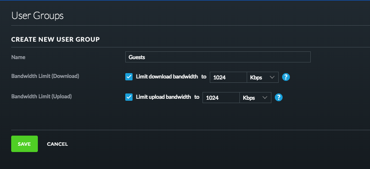Another useful feature in the UniFi Controller is the ability to limit bandwidth allocation to different user groups. This may be important to ensure guests do not limit the productivity and speed available to permanent users/critical applications. To limit guest bandwidth follow the steps below: