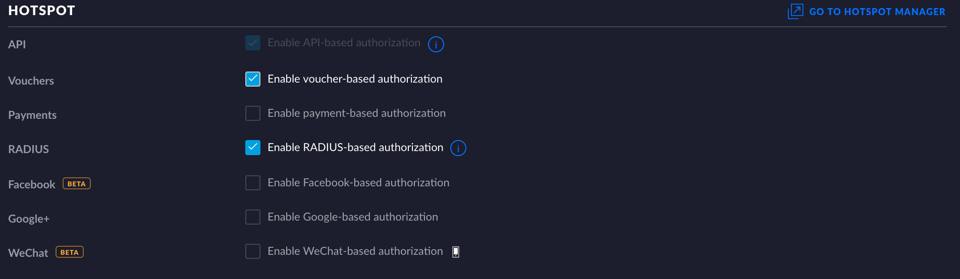 Intended as a separate guest management platform, the UniFi Hotspot System comes freely integrated into the UniFi Controller software. UniFi Controller admins and hotspot operators can access the Hotspot System via the GO TO HOTSPOT MANAGER link in Settings > Guest Control > Hotspot section. Users will be redirected to another area of the UniFi Controller for hotspot management exclusively.